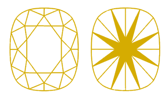 De cushion geslepen diamant heeft kenmerken van de klassieke ronde briljant. De facetten in het paviljoen zijn groter, maar de tafelbreedte is in verhouding wat kleiner. Herkenbaar is de prachtige schittering als een ster. Over de grens wordt ook wel gesproken over ‘crushed ice’, ofwel geslagen ijs, als vergelijking met de prachtige glinstering van ijskristallen.