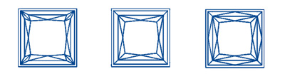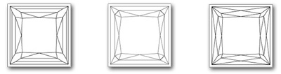 Wanneer een prinses geslepen diamant ‘slanke hoeken’ heeft, is deze meer gevoelig voor beschadigingen. Deze afwerking noemen we de ‘French cut’. Op onderstaande afbeelding ziet u een voorbeeld van deze variant. Waarbij de middelste afbeelding de originele French cut afbeeldt. Links en rechts ziet u variaties hierop.