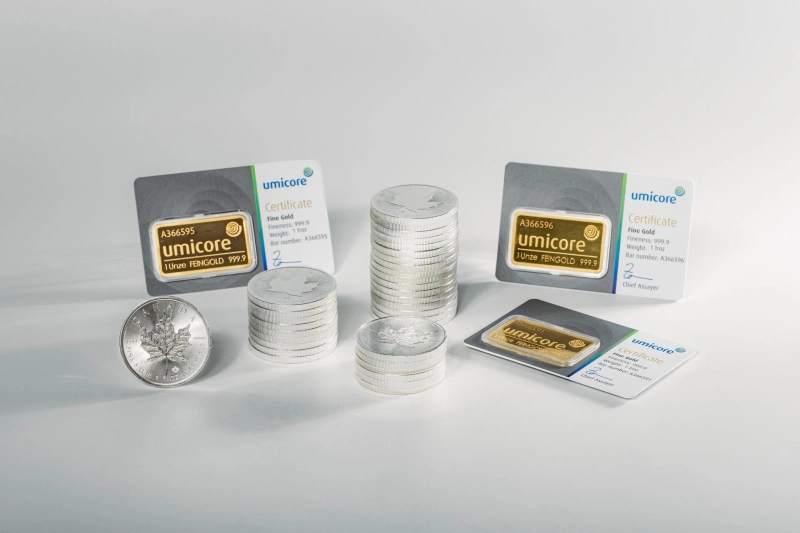 – Het pakket bevat onder andere drie goudbaren vervaardigd uit 99,99 procent puur goud van 31,1 gram en 33 zilveren Maple Leafs