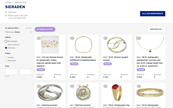 Is een kavel niet verkocht in de veiling? Dan kun je nu eenvoudig alle objecten in de aftersale bekijken via het online platform. Je klikt op de veiling in het veilingoverzicht. Vervolgens kun je filteren in de linkerkolom op de status van het object. Je kunt de filters instellen op beschikbaar, kavel verkocht, en aftersale.