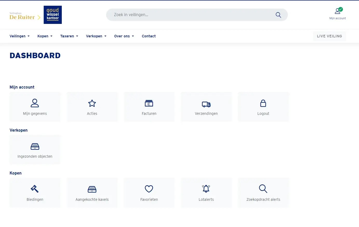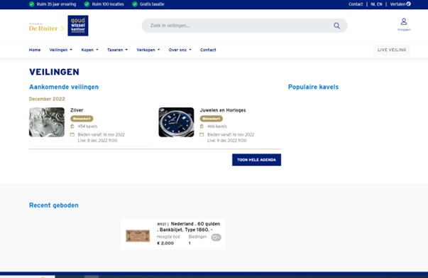 Ben je al klant van het veilinghuis en heb je vaker van ons veilingplatform gebruik gemaakt? Dan zijn er een aantal aanpassingen die je misschien al zijn opgevallen. Zo is het uiterlijk van het platform aangepast en zijn er extra functionaliteiten toegevoegd voor zowel bieders als verkopers van de veiling. Op de beginpagina van het veilingplatform ziet je in één oogopslag de aankomende veilingen, de meest populaire veilingobjecten en recente biedingen. Via de rode kop rechtsboven kun je direct navigeren naar de live veiling.