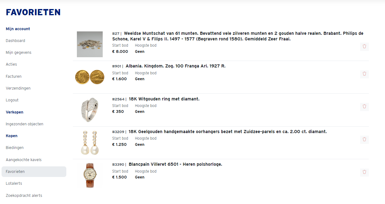 Uw complete lijst met favorieten vindt je eenvoudig terug door in het dashboard op “Favorieten” te klikken. Handig: op de dag dat jouw favorieten geveild worden, ontvangt je van ons een herinnering per mail.