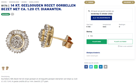 Als je telefonisch wilt bieden op het kavel die je op het oog heeft, dan reserveren wij een lijn voor je. Wij bellen je op zodra het desbetreffende kavel wordt geveild. Om je aan te melden voor telefonisch bieden, kun je op de website een account aanmaken. Heb je al een account? Dan kunt aanvraag e-mailen naar veiling@goudwisselkantoor.nl.