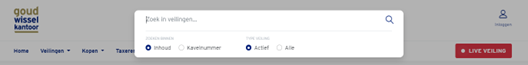 Via de zoekbalk kun je zoeken op inhoud en op het kavelnummer. Als je zoekt op inhoud kun je een zoekterm in de zoekbalk plaatsen. De zoekfunctie doorzoekt alle titels en omschrijvingen van de objecten van voorgaande en toekomstige veilingen. Ook kun je een filter toepassen om te selecteren tussen kavels die actief in de veiling zijn.