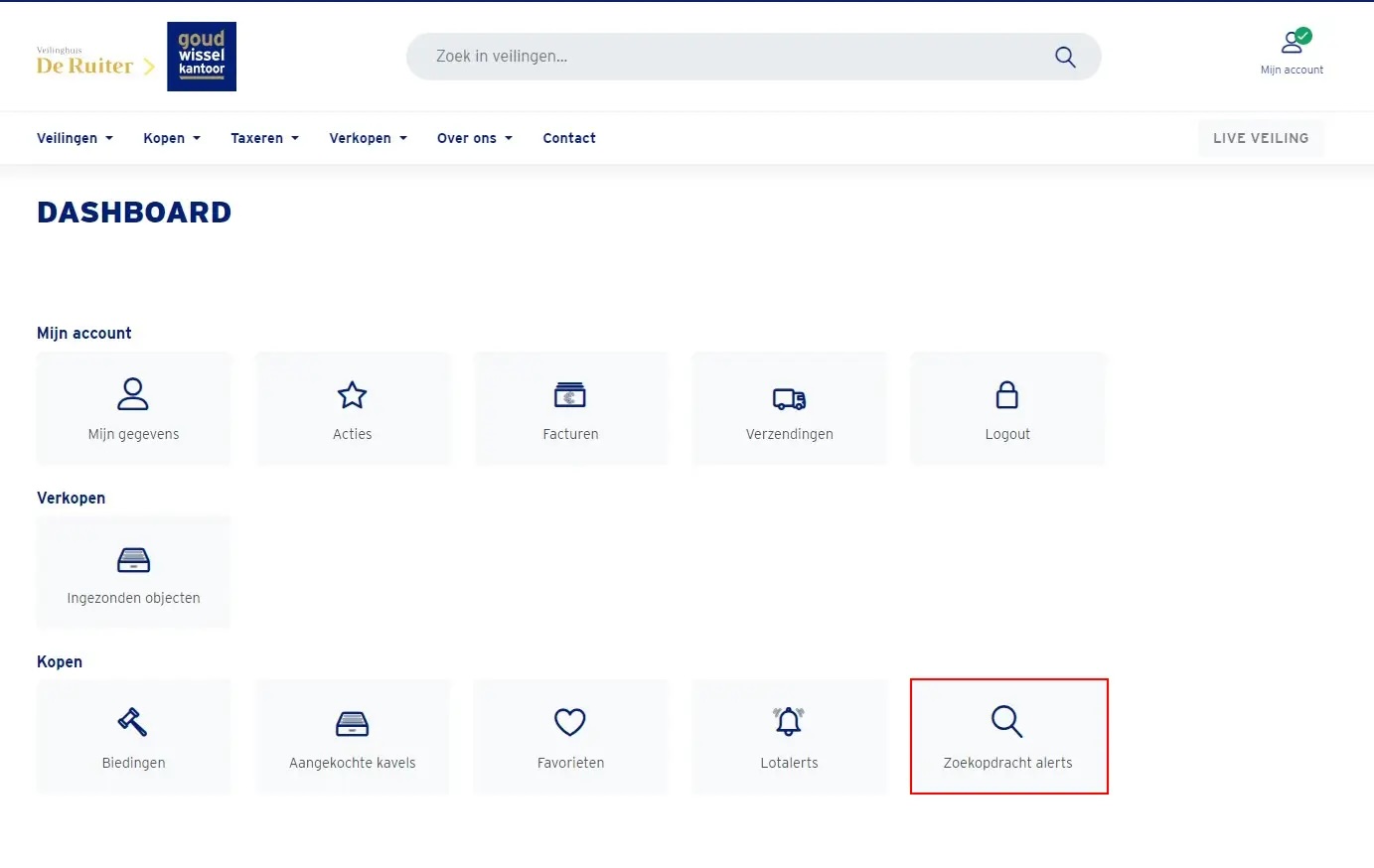 Ga in het dashboard naar de knop “Zoekopdracht alerts” en klik vervolgens op “Stel een zoekopdracht in” om zoekwoorden toe te voegen. Wanneer we kavels met dit woord aan onze online veilingcatalogus toevoegen, ontvangt je direct bericht per e-mail. U ontvangt deze melding zodra de betreffende veiling online staat en er biedingen op de kavels geplaatst kunnen worden.
